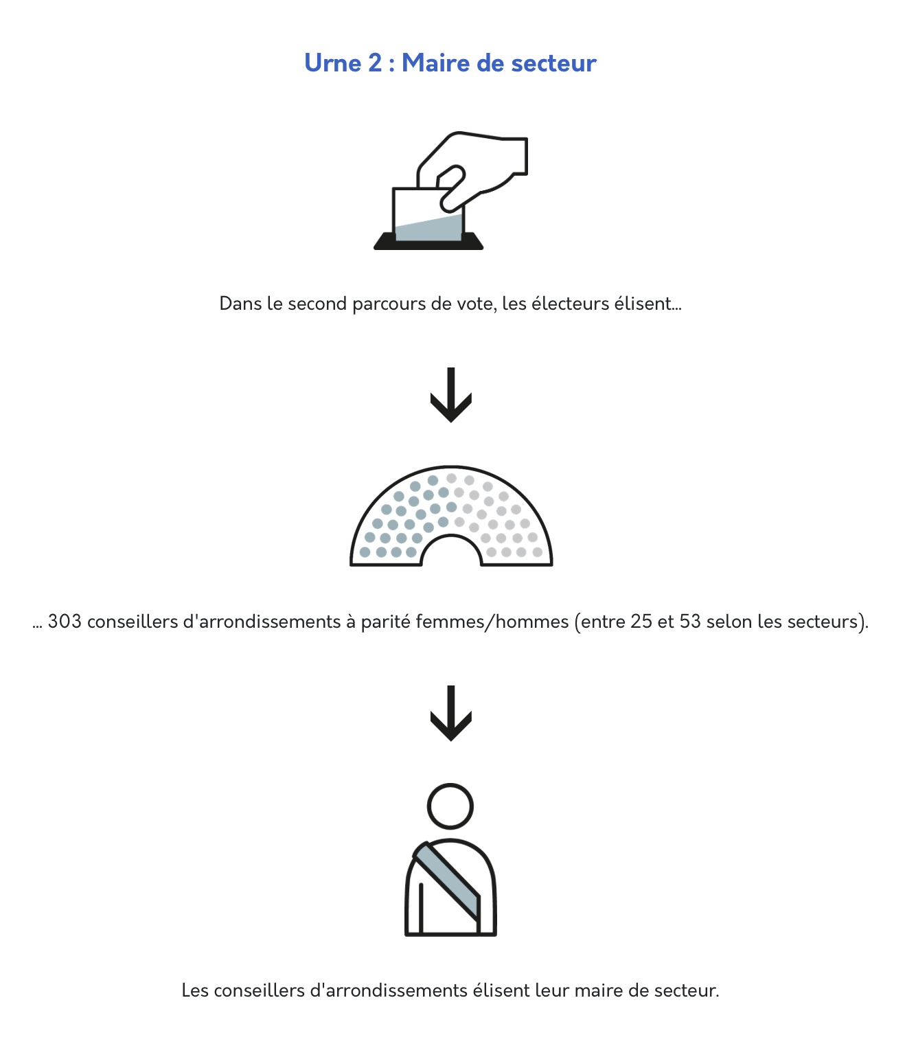 > dans une seconde urne, un second bulletin pour désigner ses représentants de secteur qui, à leur tour, éliront le Maire de secteur.
