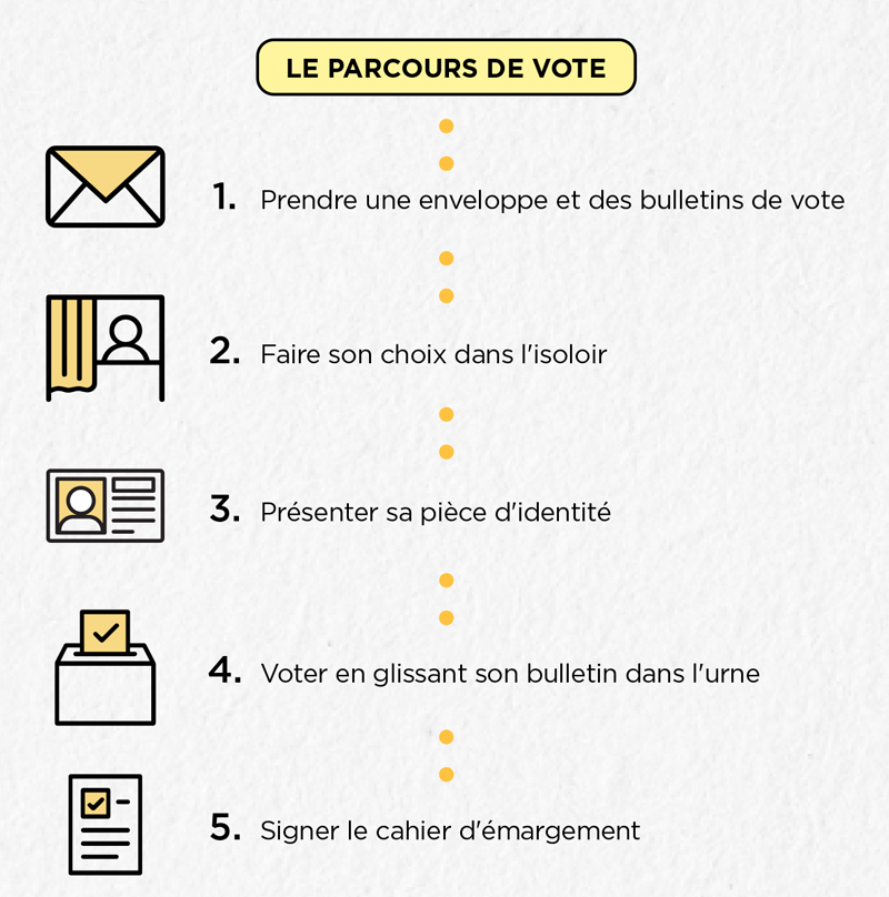 > pour chacun des deux votes, l’électeur devra suivre toutes les étapes habituelles : prendre une enveloppe de scrutin et des bulletins de vote, passer dans l’isoloir, présenter sa pièce d’identité, voter à l’urne, signer le cahier d’émargement.